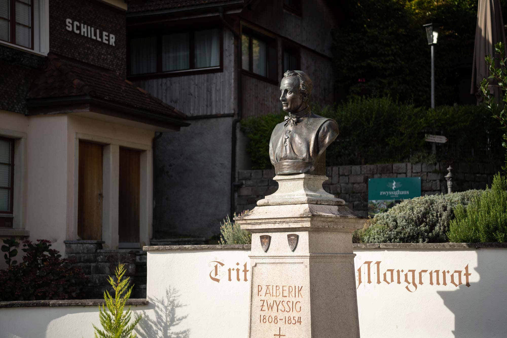 Direkt vor der Kirche in Bauen steht das Denkmal von Pater Alberik Zwyssig. Pater Zwyssig wurde im Zwyssighaus in Bauen geboren. Er lebte 1808 bis 1854. Sein Geburtshaus wurde eine Pension und ist heute ein Gastronomiebetrieb.
